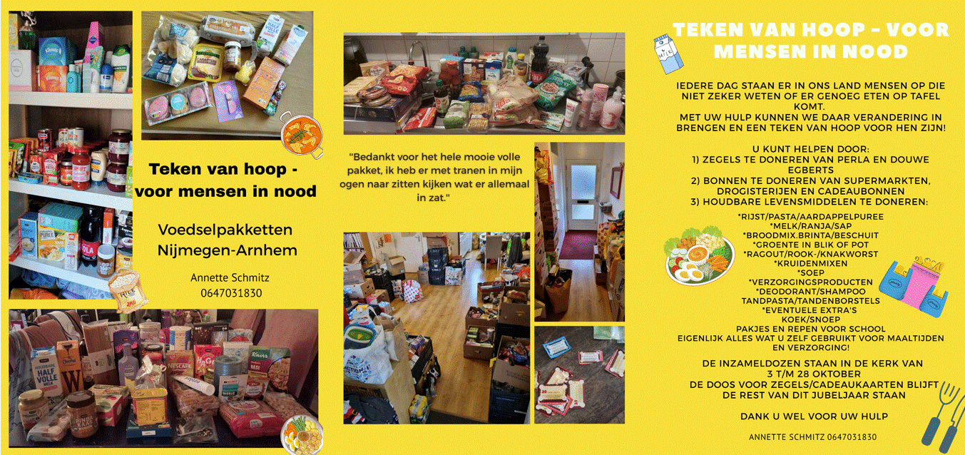 Om hen een steuntje in de rug te geven, organiseren we in de maand oktober een inzamelingsactie in onze kerk. Vanaf komend weekend staan er achterin de kerk dozen waarin u houdbare levensmiddelen kunt doneren. Op het tafeltje er naast vindt u ook een brievenbus, waarin u Perla- of Douwe Egberts-zegels, boodschappen- en cadeaubonnen, spaaractiezegels en andere kleine extra’s kunt doneren. Alles is welkom. Samen kunnen we deze mensen een klein beetje verlichting brengen. Een pakketje voedsel, een warm gebaar, een glimpje hoop. Helpt u mee?